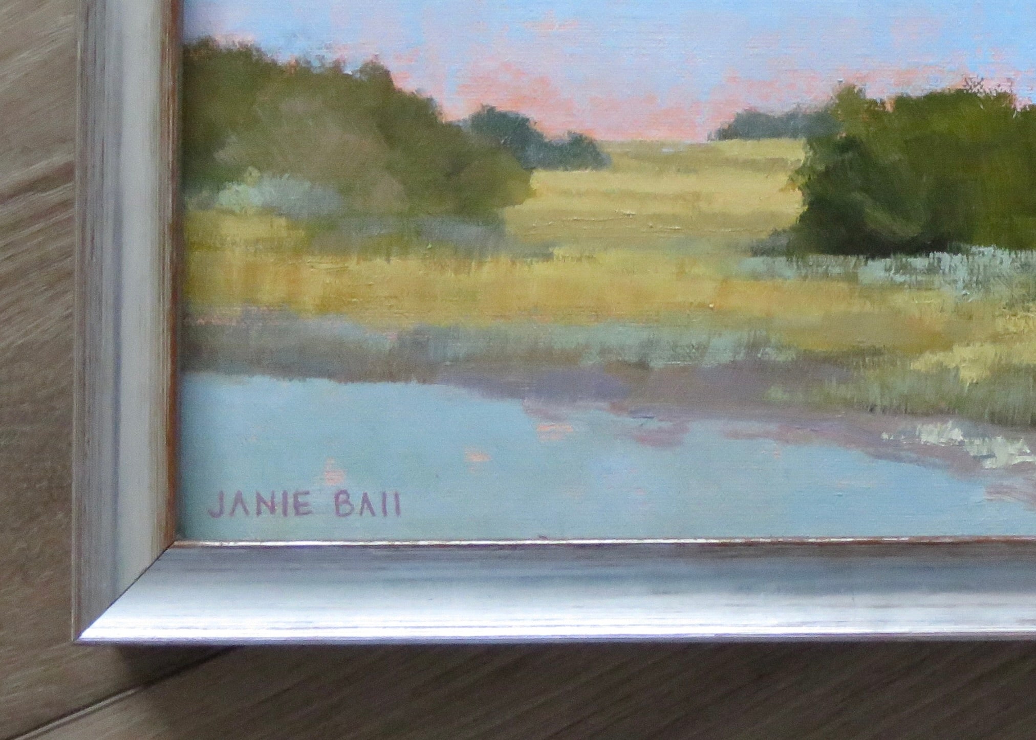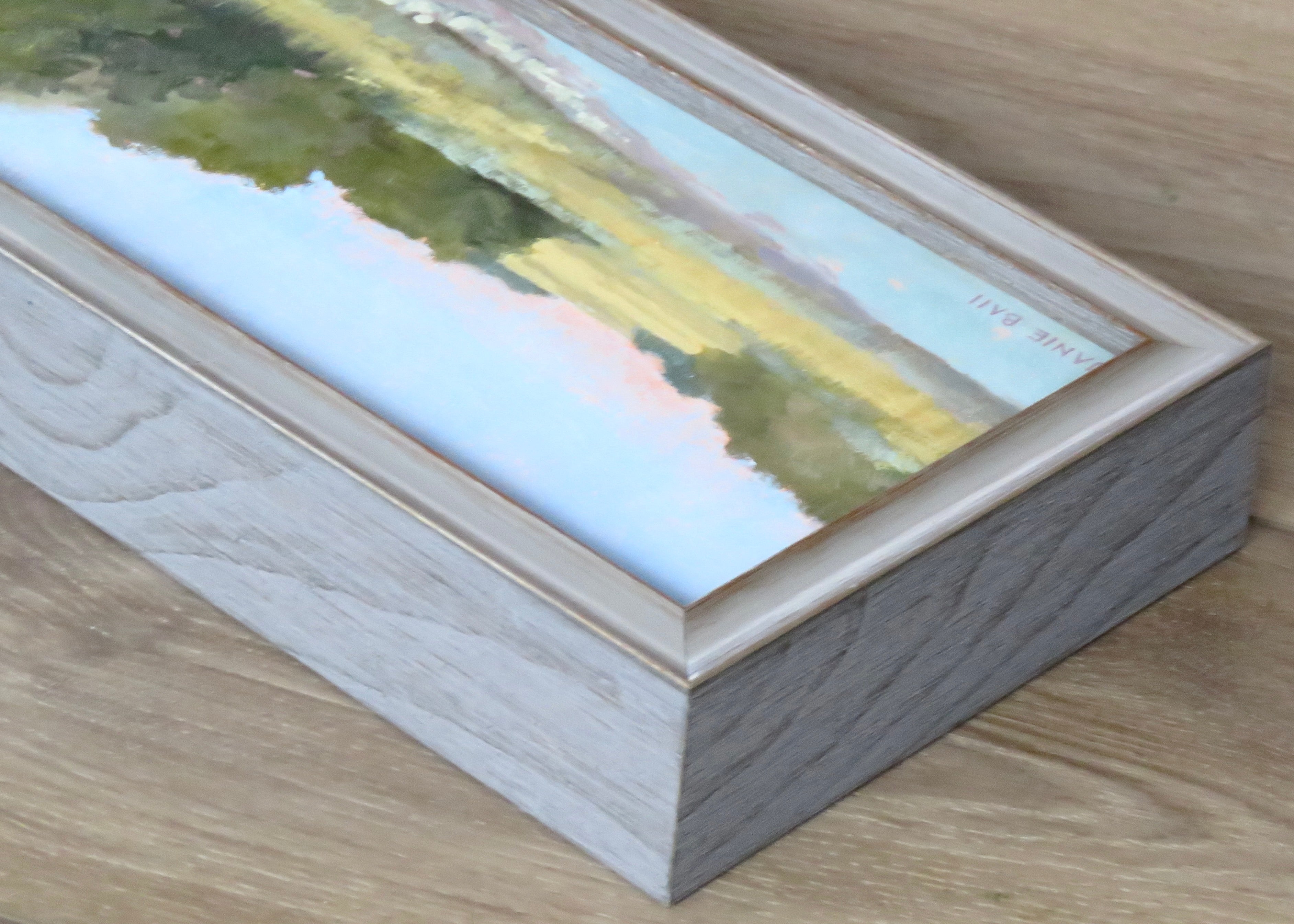 oil on linen panel, and silver and distressed wood frame