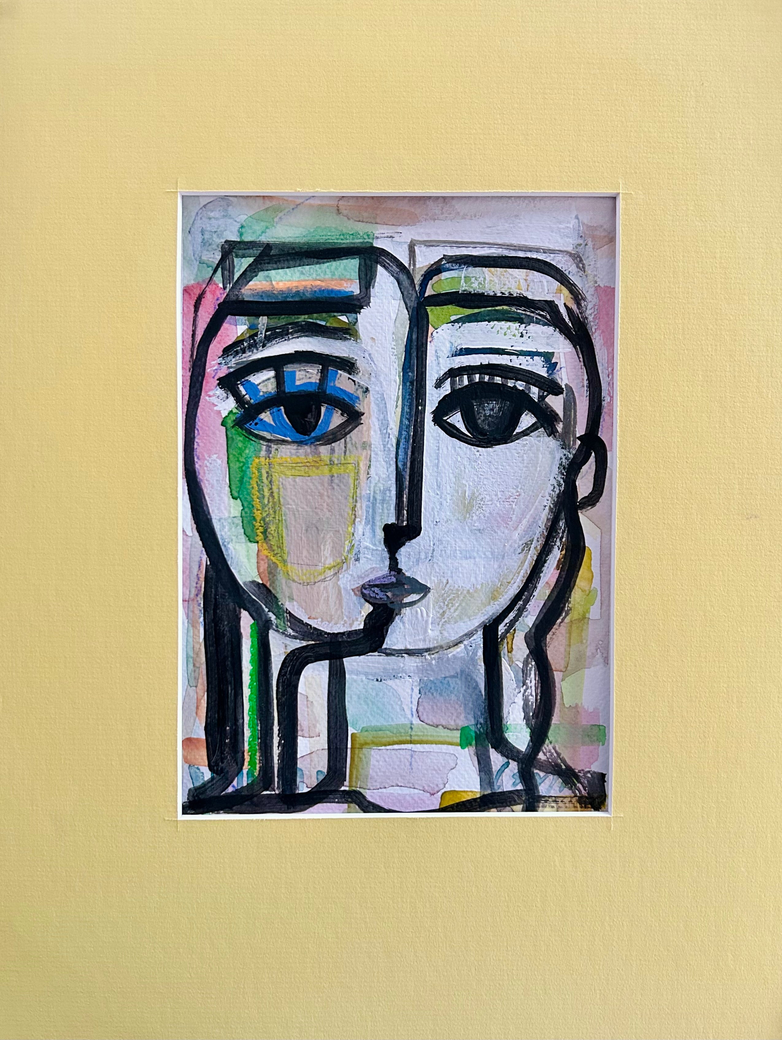 watercolor, oil pastel, and acrylic on paper, matted with yellow mat