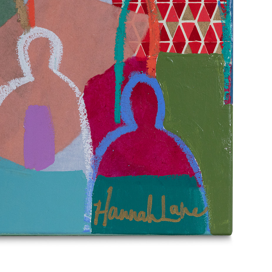 Hannah Lane is a contemporary mixed media artist celebrated for her bold use of color and dynamic, collage-like layering. A Louisiana native and graduate of the Savannah College of Art & Design, Hannah draws deep inspiration from the vibrant landscapes, diverse cultures, and heartfelt sense of family and community found in her southern roots. Her work blends pigmented Japanese papers, expressive line work, and rich washes of acrylic paint to create textured, energetic paintings. Each collection reflects her love for nature, storytelling, and community—an invitation to explore the beauty of her inner imagination. Hannah is represented by some of the top galleries in the Southeast, and her paintings are collected privately and in corporate spaces across the country. She also loves working one-on-one with collectors to create meaningful, custom pieces. After living and painting in Italy and New Orleans, Hannah now calls Nashville home, where she is part of a thriving art community. When she’s not painting in her home studio, you’ll find Hannah hiking with her boys, reading, or cooking up something seasonal and delicious! The crowd series is one of my most iconic collections, inspired by my big, beautiful Louisiana family and the joyful spirit of southern gatherings. I grew up surrounded by cousins, friends, and neighbors—many from families as large and lively as my own—where faith and family were at the heart of everything. Over the past 12 years, this series has evolved with new patterns, papers, and symbols that reflect the changing seasons of life. Each crowd painting is a kind of meditation, a reflection on the deep truth that we’re all connected. Rich with personal symbols and intuitive mark-making, these pieces push the boundaries of mixed media and invite you to see something familiar in a new way. Whether you're drawn to the vibrant energy, the quiet details, or the sense of belonging they evoke, each crowd carries its own unique aura—waiting for the right person to bring it home.