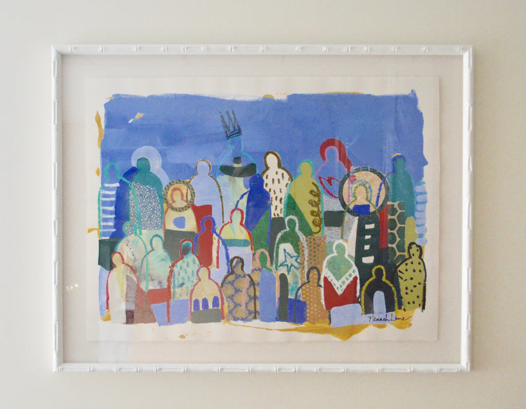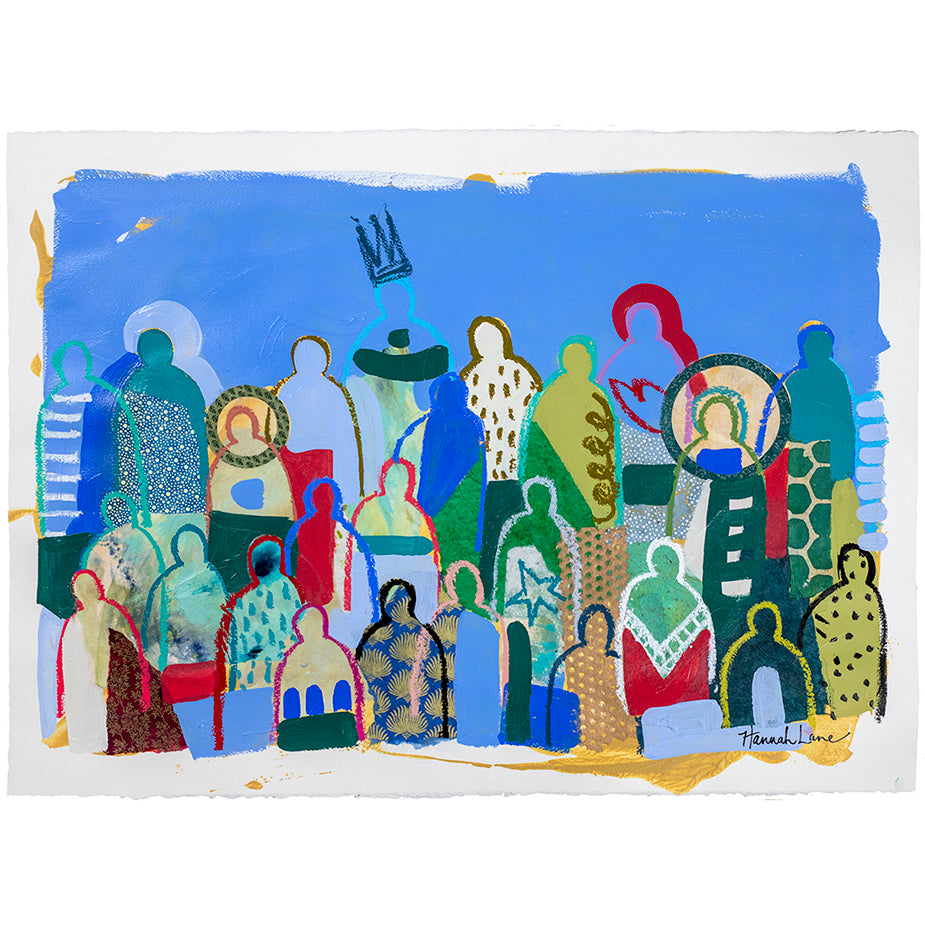 Hannah Lane is a contemporary mixed media artist celebrated for her bold use of color and dynamic, collage-like layering. A Louisiana native and graduate of the Savannah College of Art & Design, Hannah draws deep inspiration from the vibrant landscapes, diverse cultures, and heartfelt sense of family and community found in her southern roots. Her work blends pigmented Japanese papers, expressive line work, and rich washes of acrylic paint to create textured, energetic paintings. Each collection reflects her love for nature, storytelling, and community—an invitation to explore the beauty of her inner imagination. Hannah is represented by some of the top galleries in the Southeast, and her paintings are collected privately and in corporate spaces across the country. She also loves working one-on-one with collectors to create meaningful, custom pieces. After living and painting in Italy and New Orleans, Hannah now calls Nashville home, where she is part of a thriving art community. When she’s not painting in her home studio, you’ll find Hannah hiking with her boys, reading, or cooking up something seasonal and delicious! The crowd series is one of my most iconic collections, inspired by my big, beautiful Louisiana family and the joyful spirit of southern gatherings. I grew up surrounded by cousins, friends, and neighbors—many from families as large and lively as my own—where faith and family were at the heart of everything. Over the past 12 years, this series has evolved with new patterns, papers, and symbols that reflect the changing seasons of life. Each crowd painting is a kind of meditation, a reflection on the deep truth that we’re all connected. Rich with personal symbols and intuitive mark-making, these pieces push the boundaries of mixed media and invite you to see something familiar in a new way. Whether you're drawn to the vibrant energy, the quiet details, or the sense of belonging they evoke, each crowd carries its own unique aura—waiting for the right person to bring it home.