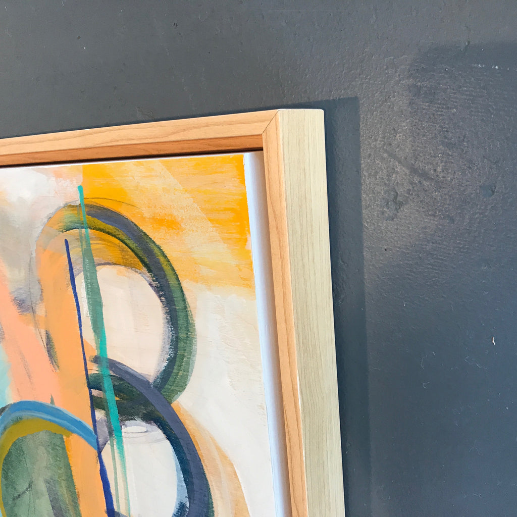 acrylic and resin and oil pastel cradled birch board, framed in natural wood floater frame