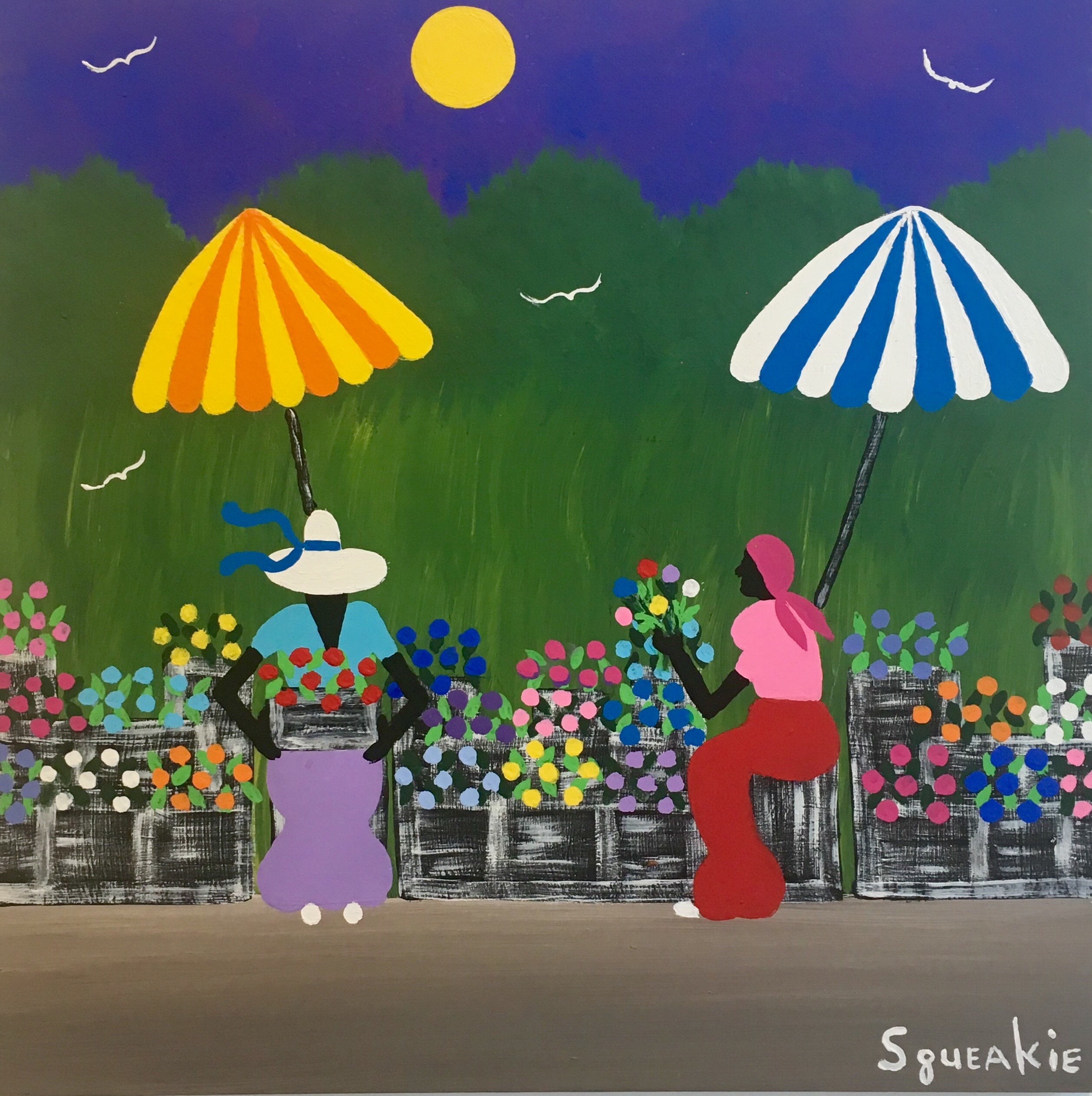 Squeakie is a self-taught artist from the rural Lowcountry whose nostalgic paintings portray a simpler way of life in Coastal South Carolina. He draws his inspiration from memories of childhood where he often worked in tobacco and cotton fields. He talks about this time in his life as "the work was hard, but life was slower, more simple- not so many distractions and bills to pay." He went on to work in factories and grocery stores until he became a house painter for nearly 25 years. Like many self-taught artists, Squeakie did not start creatively painting until later in his life. He was encouraged to do so by his Uncle Henry "Squirrel" Stone, who was a folk artist himself. One of Squirrel's clients asked for a commissioned painting of a church. Squirrel passed this commission on to Squeakie. Since that first painting, Squeakie has a resolute sense of purpose in his work. In 2007 he became a full-time artist, and now his "naive, down-home pictures" have been bought by collectors across the United States, and abroad. He says he paints more now than when he painted houses as his paintings tend to get snapped up quickly.