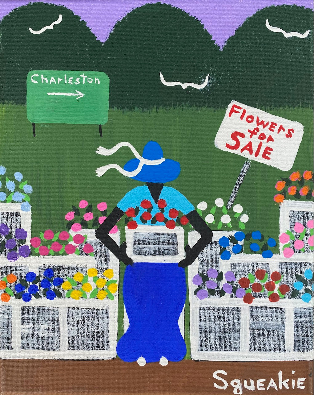 Squeakie is a self-taught artist from the rural Lowcountry whose nostalgic paintings portray a simpler way of life in Coastal South Carolina. He draws his inspiration from memories of childhood where he often worked in tobacco and cotton fields. He talks about this time in his life as "the work was hard, but life was slower, more simple- not so many distractions and bills to pay." He went on to work in factories and grocery stores until he became a house painter for nearly 25 years. Like many self-taught artists, Squeakie did not start creatively painting until later in his life. He was encouraged to do so by his Uncle Henry "Squirrel" Stone, who was a folk artist himself. One of Squirrel's clients asked for a commissioned painting of a church. Squirrel passed this commission on to Squeakie. Since that first painting, Squeakie has a resolute sense of purpose in his work. In 2007 he became a full-time artist, and now his "naive, down-home pictures" have been bought by collectors across the United States, and abroad. He says he paints more now than when he painted houses as his paintings tend to get snapped up quickly.