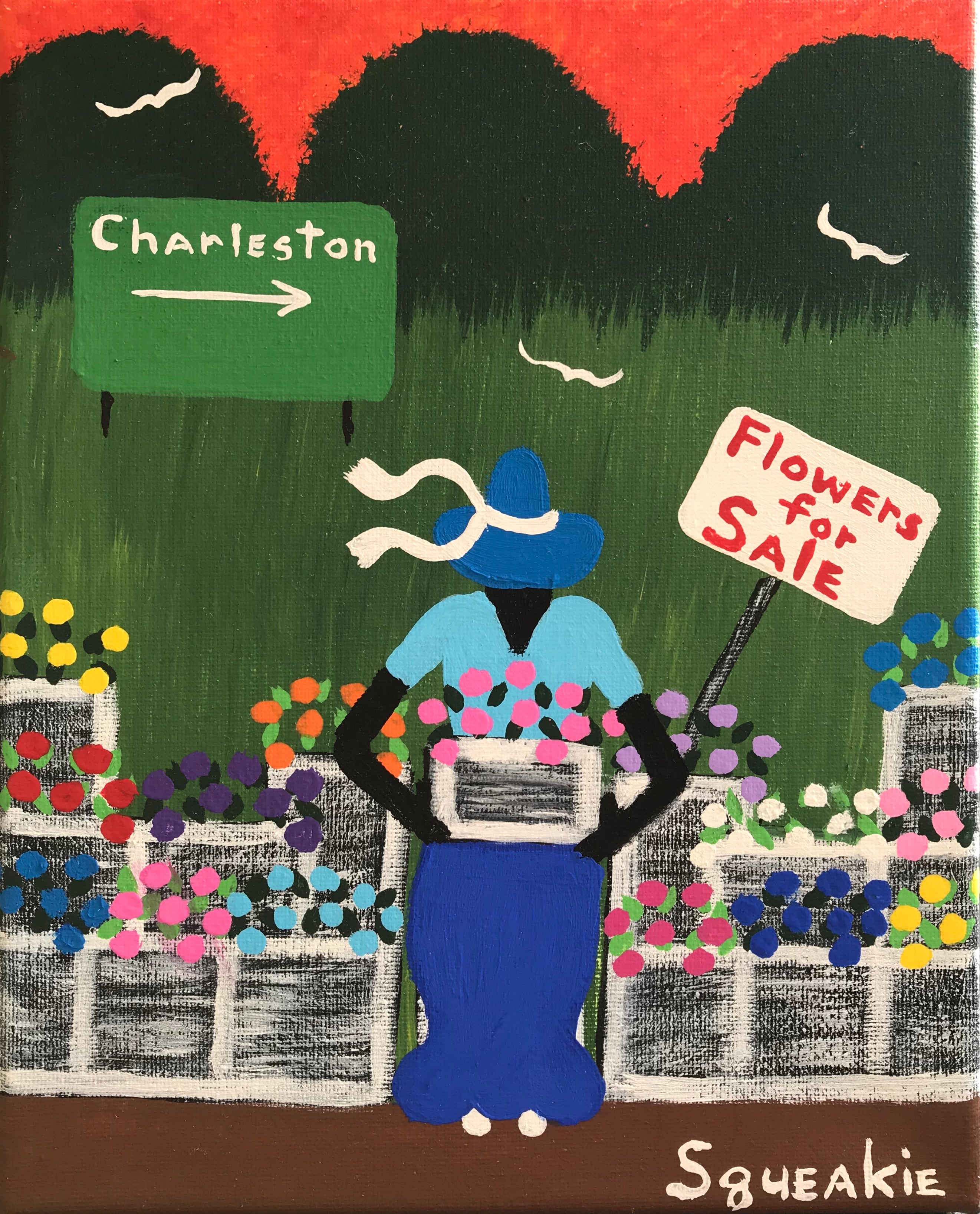 Squeakie is a self-taught artist from the rural Lowcountry whose nostalgic paintings portray a simpler way of life in Coastal South Carolina. He draws his inspiration from memories of childhood where he often worked in tobacco and cotton fields. He talks about this time in his life as "the work was hard, but life was slower, more simple- not so many distractions and bills to pay." He went on to work in factories and grocery stores until he became a house painter for nearly 25 years. Like many self-taught artists, Squeakie did not start creatively painting until later in his life. He was encouraged to do so by his Uncle Henry "Squirrel" Stone, who was a folk artist himself. One of Squirrel's clients asked for a commissioned painting of a church. Squirrel passed this commission on to Squeakie. Since that first painting, Squeakie has a resolute sense of purpose in his work. In 2007 he became a full-time artist, and now his "naive, down-home pictures" have been bought by collectors across the United States, and abroad. He says he paints more now than when he painted houses as his paintings tend to get snapped up quickly.