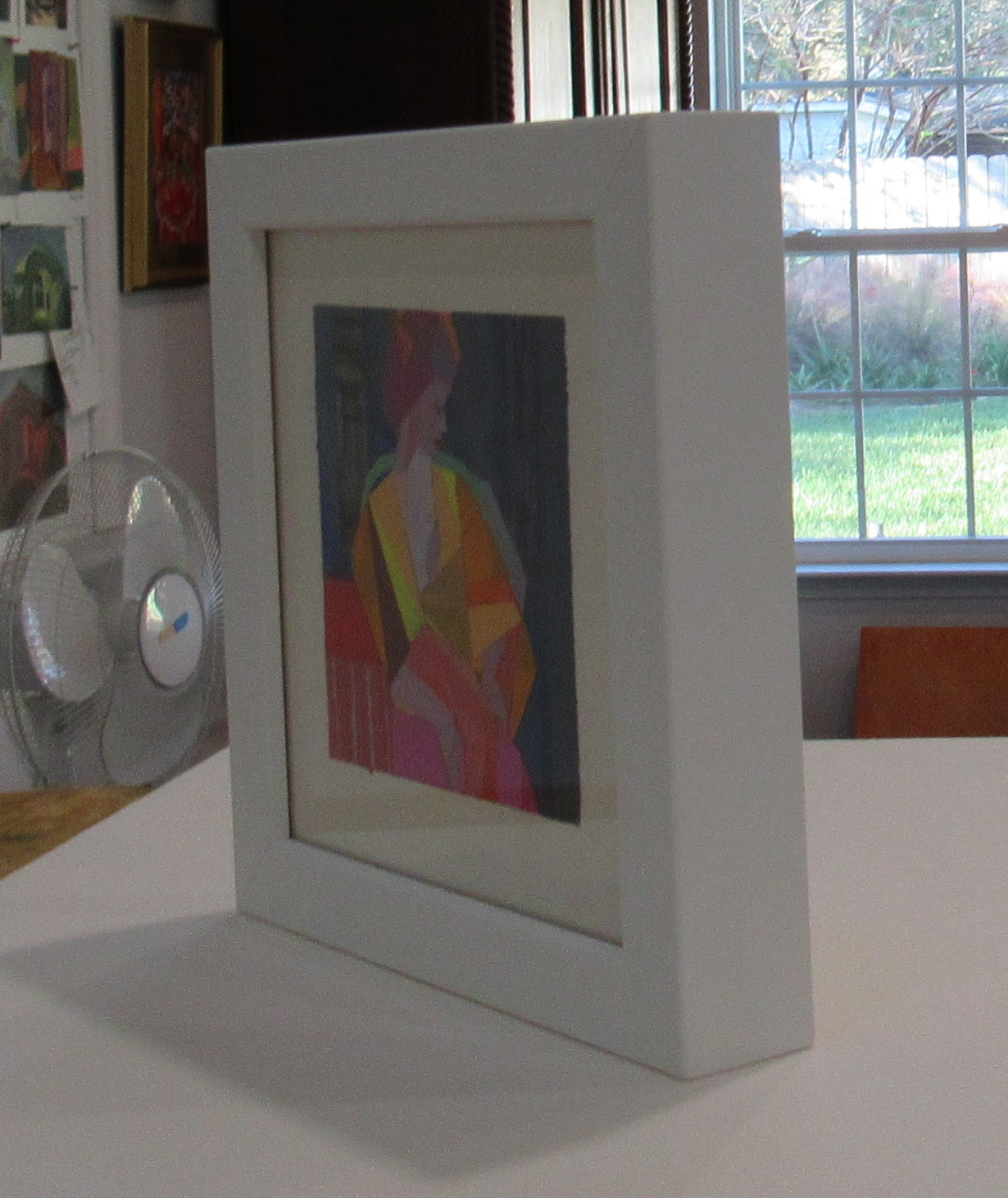 collage on paper, framed in white frame
